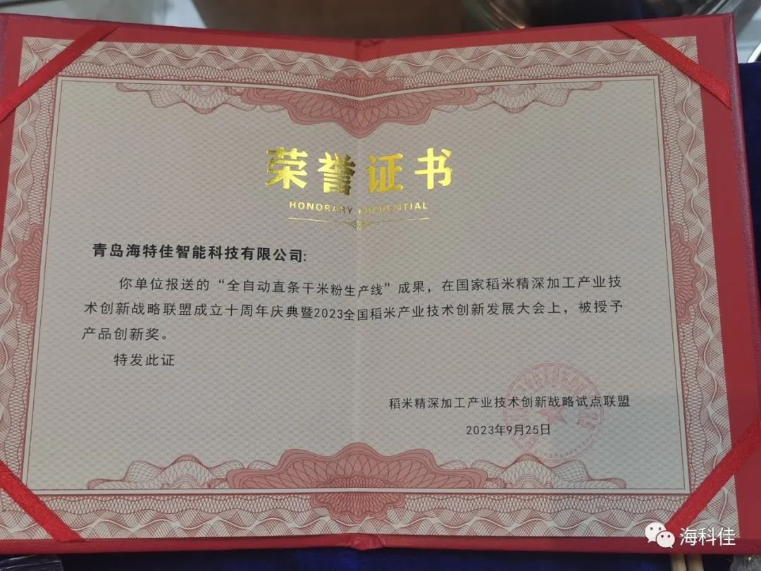 9月24日至26日,國家稻米精深加工產業技術創新戰略聯盟成立十周年慶典暨2023創新發展大會在湖北武漢舉辦。本次大會以“十年‘稻’路,創新未來”為主題,匯集了中國科學院院士張啟發,中國工程院院士孫寶國、張洪程、胡培松等專家,以及300多位稻米全產業鏈的專家學者、企業代表共同出席會議,共同探討稻米精深加工產業技術創新發展。青島海科佳“全自動直條米粉生產線”獲得各位專家評委的好評,在本次大會上榮獲“創新產品獎”,并作題為《米粉智能化裝備的發展與行業變革》的專題報告。