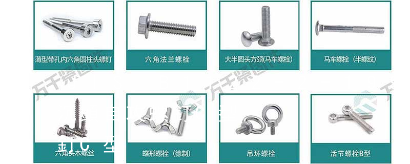 螺栓有:1、方頭螺栓,2、半圓頭方頸螺栓,3、十字槽盤頭螺釘,4、內六角沉頭螺釘,5、方螺母C級,6、蝶形螺母,7、六角頭螺栓,8、十字槽盤頭自攻螺釘。大小有M18、M6、M8、M16、M10、M12、M14、M20等型號。通常用