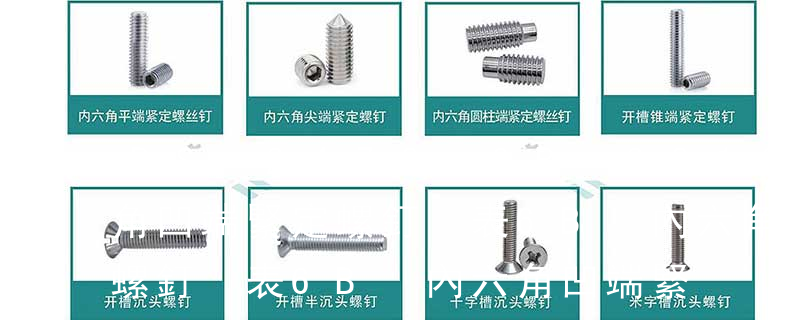 不銹鋼螺絲產品主要有:外六角螺栓、圓柱頭內六角螺釘(杯頭)、內六角凹端緊定螺釘(凹端機米)、內六角平端緊定螺釘(平端機米)、內六角尖端緊定螺釘(尖端機米)、內六角柱端緊定螺釘(柱端機米)、沉頭內六角螺釘(平杯)